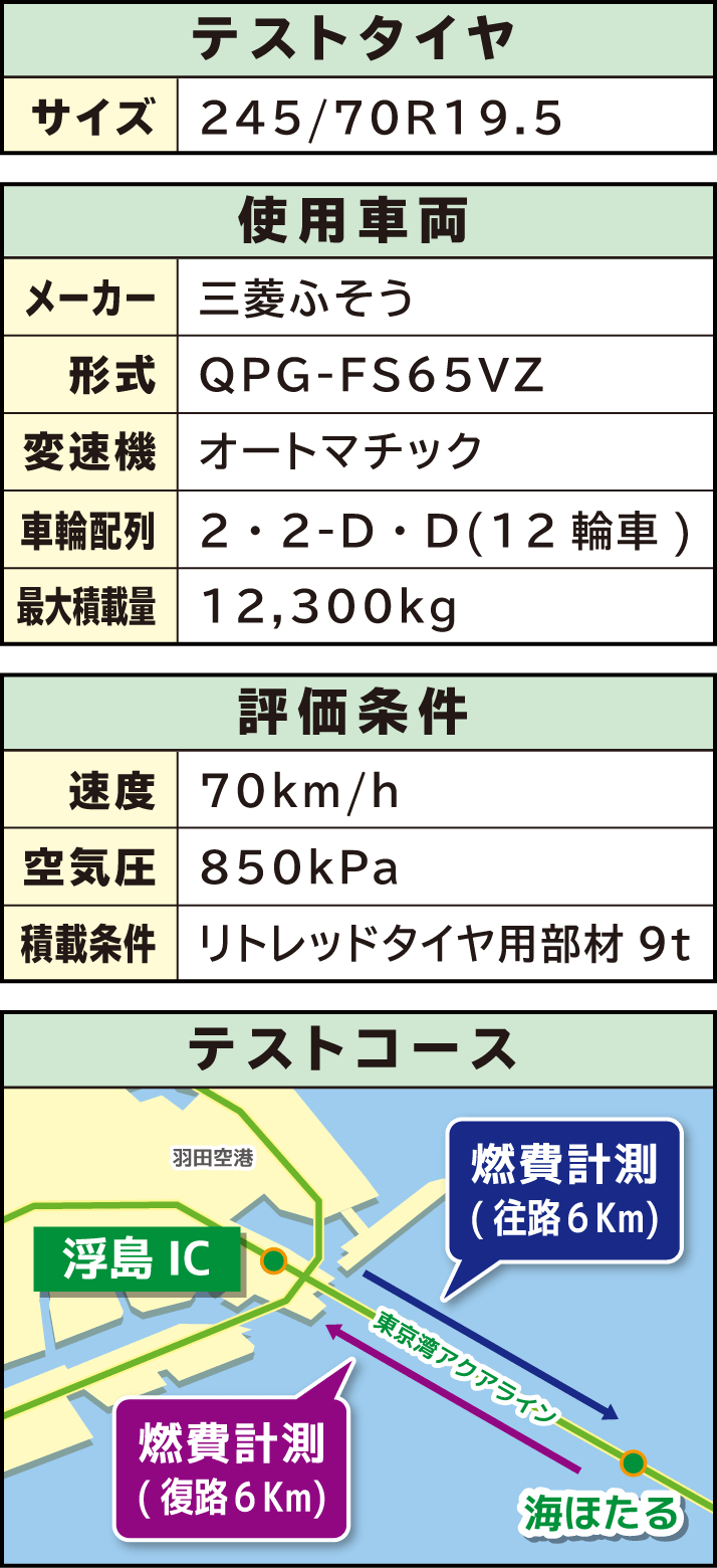 テストは、東京湾アクアライン・浮島ICから海ほたるPA間の6kmを、9トンの荷物を積んで、時速70kmでそれぞれ往復した。使用車両は三菱ふそうトラック・バスのスーパーグレート。