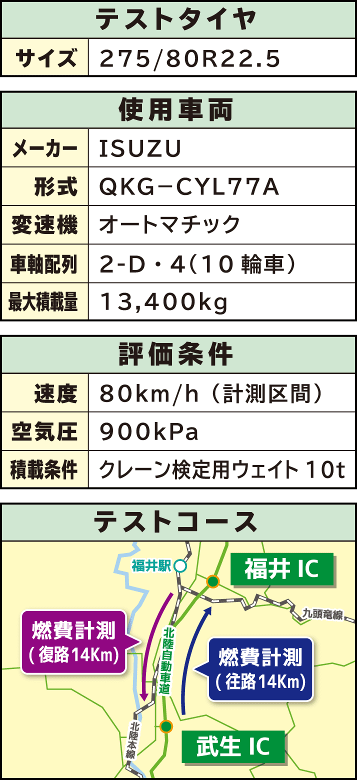 計測では、いすゞギガに10トンのクレーン検定用ウェイトを積載。武生商工会議所を出発し、武生ICから福井ICの往復28kmで燃費を測った。