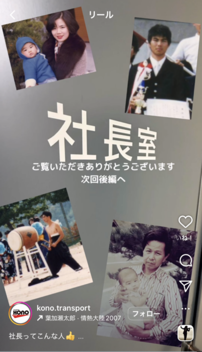 最長90秒の動画が投稿できるリールを中心に、各拠点の特徴や日々の業務を発信。健康経営の一環で簡単にできるストレッチ動画も公開する。なかでも特に同社らしさが伝わるのが河野社長の紹介だ。導入編ではプロフィールとメッセージを簡潔に投稿。続く一問一答では経営の信条ややりがい、大学時代の思い出や「朝目覚めたときに思うこと」など、社長の人となりがわずかな時間で端的に伝わる内容だ。