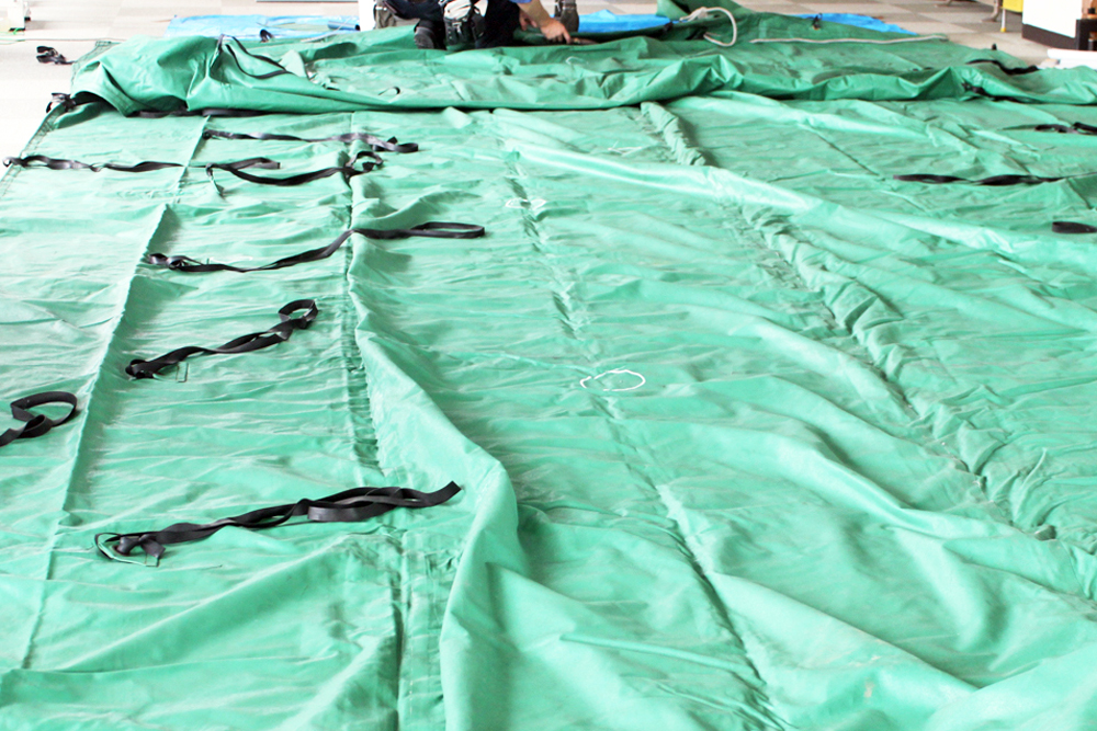 修理手順は、まずトラックシートを広げて破損している箇所を確認。同社担当者は、「第一工場では、約5m×約12mまでのシートを広げられるため、天候や昼夜問わず屋内でシートを広げて作業ができる。明るい照明の元、破損箇所の確認漏れがないように、入念にチェックしていく」と説明する。