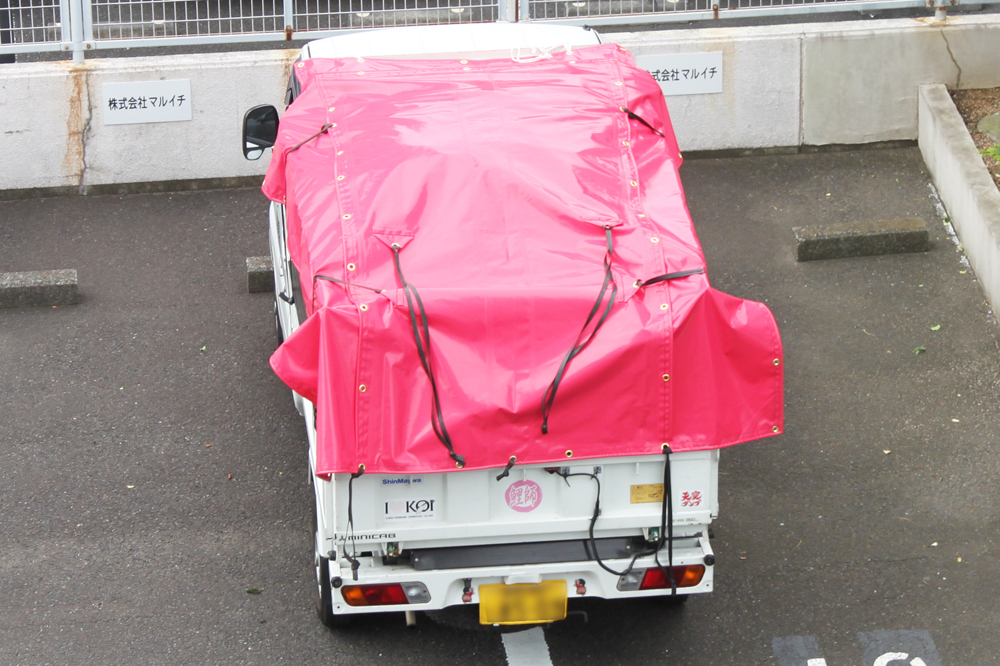 一昨年には、同社で初となるピンクのトラックシートを受注。「珍しいピンクのシートは、トラック装着後もよく目立つ」とし、「トラックの荷台に合わせた特注サイズで、形状もご要望にお応えして凸型で製作した」と振り返る。「周囲のハトメ以外にもオプションで『帯ハトメ』と『ペケット』を追加。ペケットの向きや位置などは顧客と打ち合わせし、ゴム輪を一番かけやすい箇所に取り付けている」。