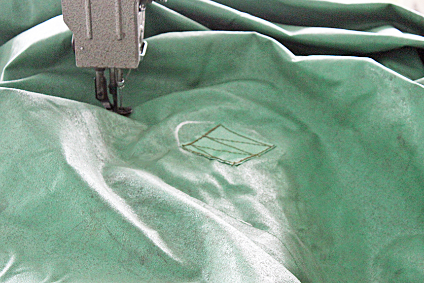 次は補修の工程となり、カットした生地を破損箇所に縫い付ける。