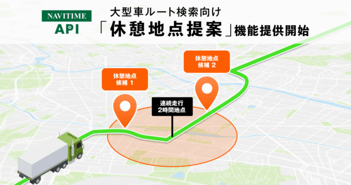 ナビタイムジャパンは、法人向け地図・ルート検索API「NAVITIME API」の大型車向けルート検索に、大型車が止められる休憩地点の提案機能の提供を開始した。