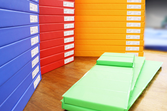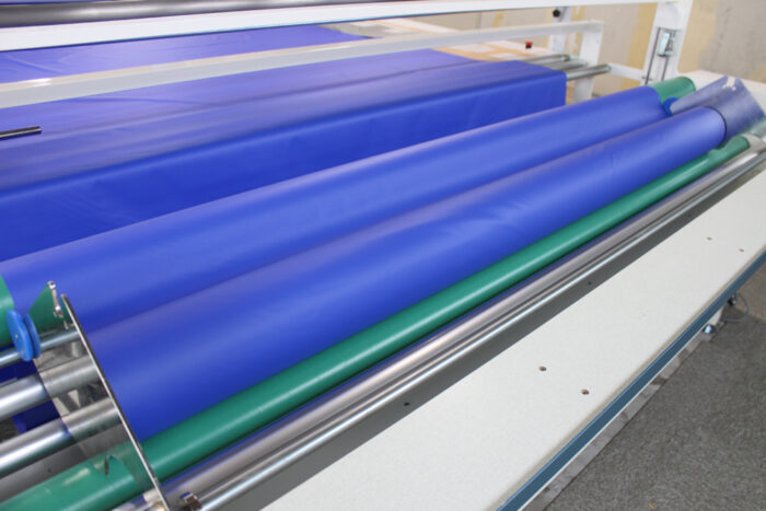 緩衝材の芯材として最適な「サンテックフォーム」だが、「耐候性が低いという弱点があり、屋外でそのまま使用すると、すぐに傷んでしまう」とも。「そんな弱点を補うのが、ロールマットの生地に使用している『国産ブランドターポリン』。横断幕やテントなどにも使用される生地で、耐久性・防水性・耐候性に優れている」という。「ロールマットは、国産ブランドターポリン生地でサンテックフォームを包むことにより、屋外での芯材の劣化を防ぎ、長期使用を可能にしている」と胸を張る。