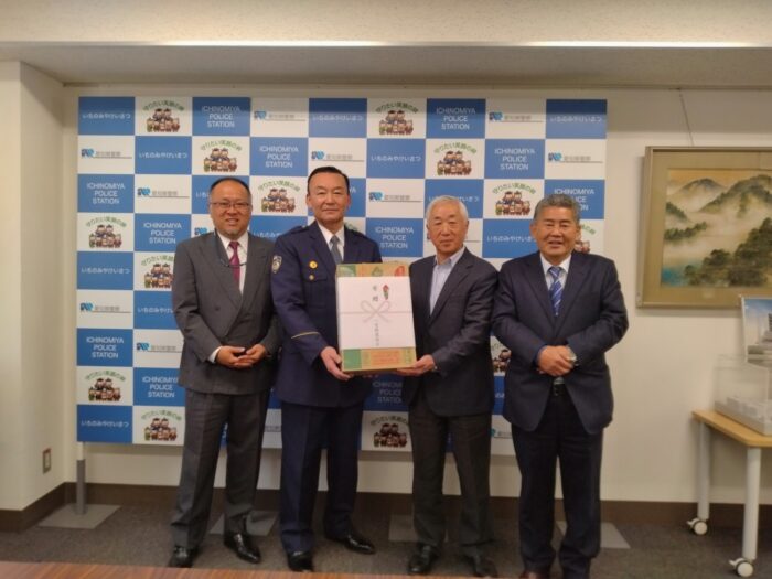 1月27日、栁橋会長と牛田勝己(丸久運輸)・山本大輔(山運)両副会長は一宮署を訪れ、景山健治署長へ目録の代わりとして12食入りのカップ麺1ケースを手渡した。景山署長は同会による日頃の活動と力添えに感謝し、「交通事故をなくすため、今年もトラックドライバーの皆さんが模範となり安全への機運を高めてほしい。引き続き支援を」と礼を述べた。