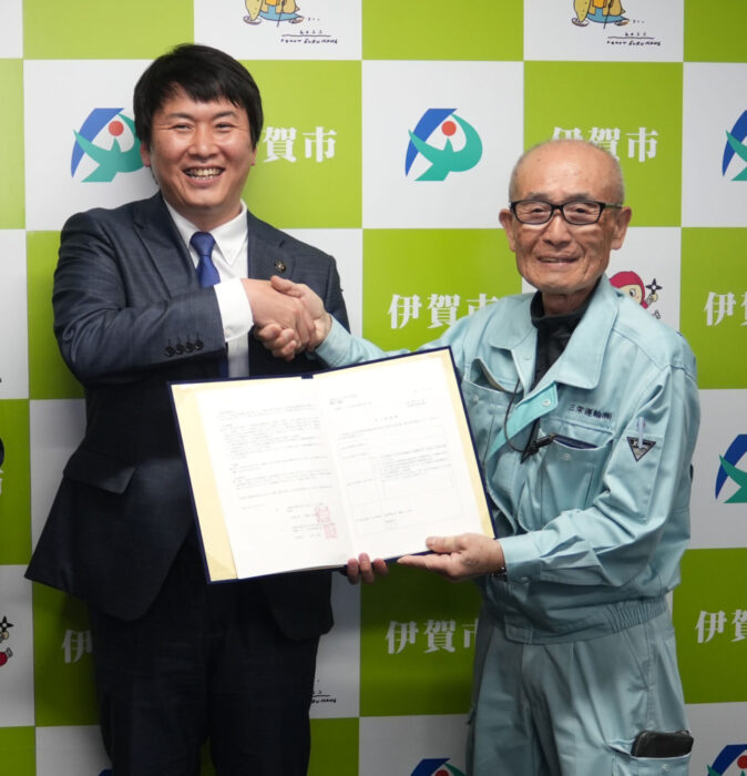 会場では稲森稔尚市長が山本支部長を出迎え、経過の報告とともに互いが協定書へと押印。伊賀支部として行政側とこうした協定を交わすのは初で、今後も管内の市町村へとその動きを広げていきたい考えだ。