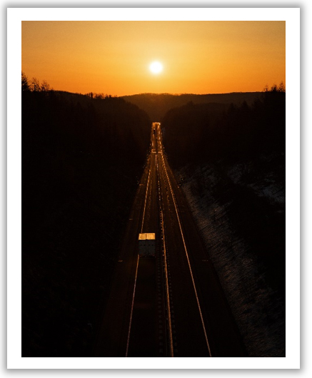 「高速道路のある風景」部門の最優秀賞に対して、伊藤教授は「どこまでも続く直線の道路という北海道らしい被写体に加え、シンメトリー(左右対称)の構図の中心に、奇跡的に朝日が配置されている。地平線のシルエットのうえに広がる朝焼けの空、その光が道路やトラックに反射する様(あるいは反対に見えない部分)が、物語性や情感を喚起してくるよう」と講評した。