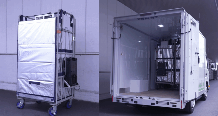 アルフレッサ府中事業所(同府中市)が担当する病院への医薬品の配送で、断熱・保冷機能付きの輸送機材をEVトラックに積み込み、定温配送を行う。使用するのは最大積載量1トンの日野デュトロZ EV、輸送用機材には、ヤマト運輸がデンソーと開発した小型モバイル冷凍機「D―mobico(ディー・モビコ)」を搭載し、断熱箱と組み合わせることで、配送時のCO2を削減できる。