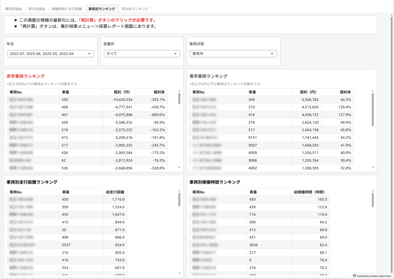 こうして集めたデータをもとに、車両別・荷主別の収支をグラフ・ランキング化で可視化し、自社の状況を正確に把握することができる。