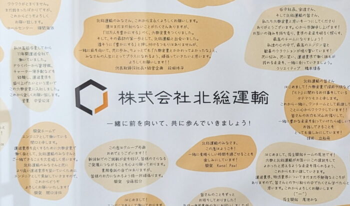 グループ加入にあたり、段林社長は谷中社長へ巻物状の長文の手紙を贈った。出会いからグループに迎えるにあたっての思いをしたためた。また、北総運輸の事務所玄関には六興実業の社員から贈られた寄せ書きが飾られている。新たに仲間に加わった同社への温かいメッセージが並ぶ。新たな出会いによって、「未来」の話ができるようになった。