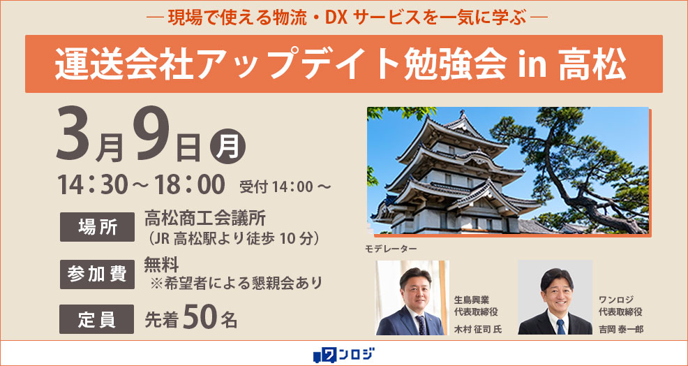 トラック運送業界のDX推進を支援するワンロジ(吉岡泰一郎社長、東京都新宿区)は3月9日に、運送経営者や後継者を対象とした「運送会社アップデイト勉強会in高松〜現場ですぐ使える物流・DXサービスを一気に学ぶ〜」を開催する。
