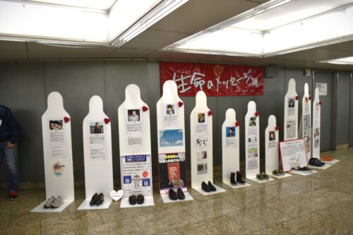 同イベントは交通事故で理不尽に生命を奪われた犠牲者が主役のアート展。犠牲者一人ひとりの等身大パネル、本人の写真、生前履いていた靴、残された家族のメッセージにより、「生命の大切さ」を訴えている。